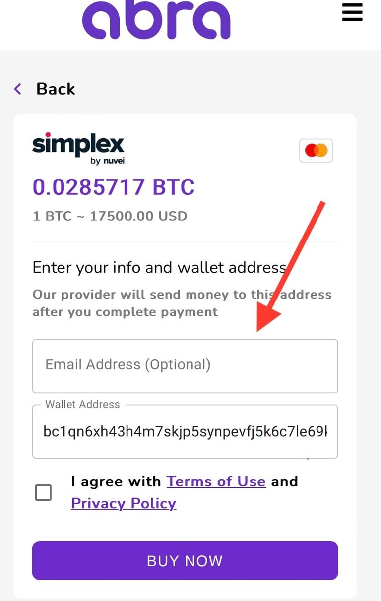 Before clicking on the "Make payment now via simplex" button, make sure to scan or copy the BTC address.