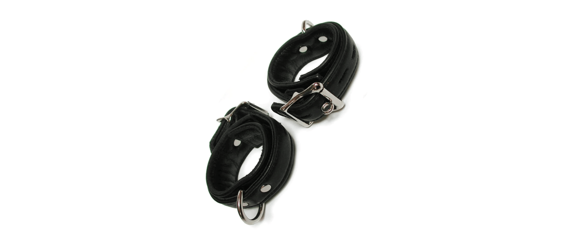These premium garment leather wrist cuffs are 1½" wide, leather-lined, and made of durable garment leather. The cuffs are lined so they're smooth on the inside and reinforced so they're strong enough to hold up in serious bondage scenes.