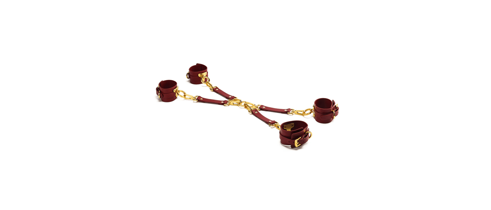Bondage boutique leather hogtie, used with handcuffs and ankle cuffs, this product makes various positions possible. As the belts may be connected with the central ring or used separately, a great variety of usages can be offered.